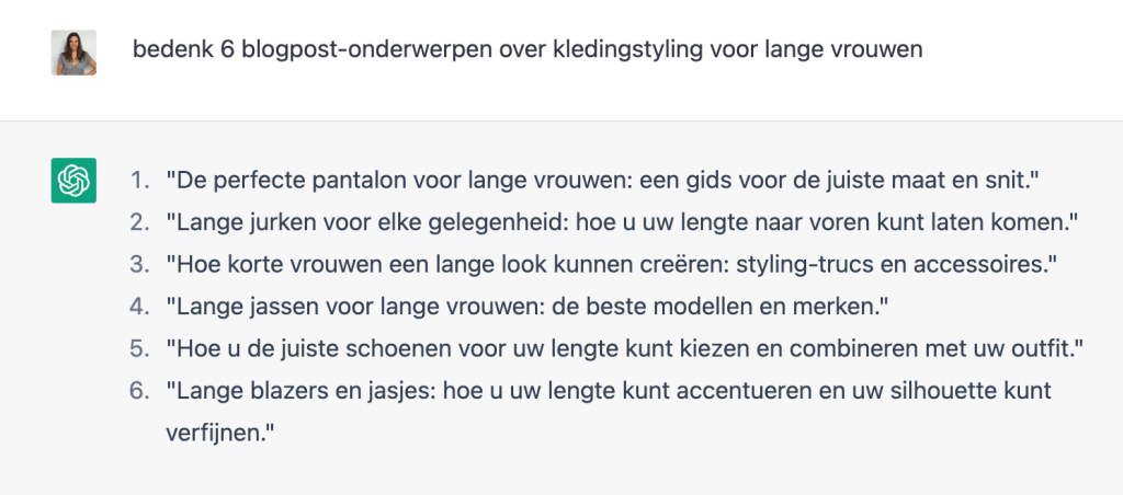 Om je een voorbeeld te geven: laten we nu doen alsof ik een kledingmerk voor lange vrouwen heb. (Oh wacht, dat heb ik!). Ik meld me aan voor ChatGTP en vraag het om “6 blogpost-onderwerpen te bedenken over kledingstyling voor lange vrouwen”. ChatGPT genereert vervolgens een lijst met suggesties zoals “De perfecte pantalon voor lange vrouwen: een gids voor de juiste maat en snit” en “Lange jassen voor lange vrouwen: de beste modellen en merken”. Het is (nog) niet perfect, maar ook zeker niet slecht, toch?